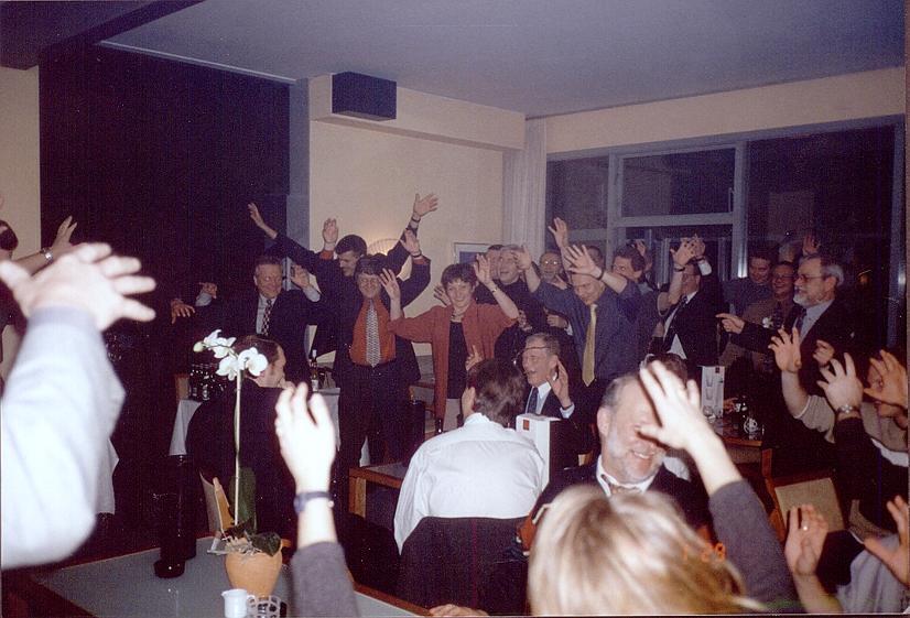 På billedet herunder er firmaet på salgsmøde i en weekend på Hvide Hus i Køge (vist nok Comwell idag) og vi blev inddelt i grupper og skulle lave en sang. Rolig, der var mening med galskaben men lidt langt at forklare.