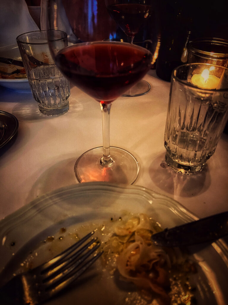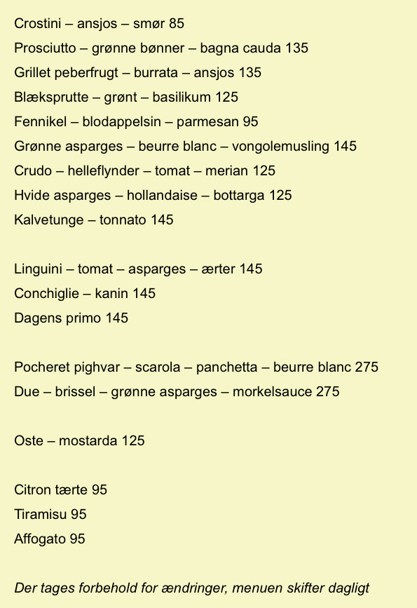 Burde jeg havde vidst ? Det synes jeg ikke. Nogle af retterne er mere franske – fx citrotærte, hvide asparges i hollandaise, beurre blanc og kortet med vine indholder lige så mange franske som italienske vine.