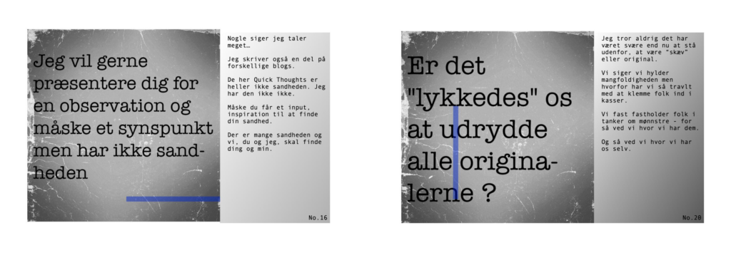 Der er hurtige, korte tanker og ideer jeg har skrevet ned og sat op i et kvadratisk format. Fra 2015.